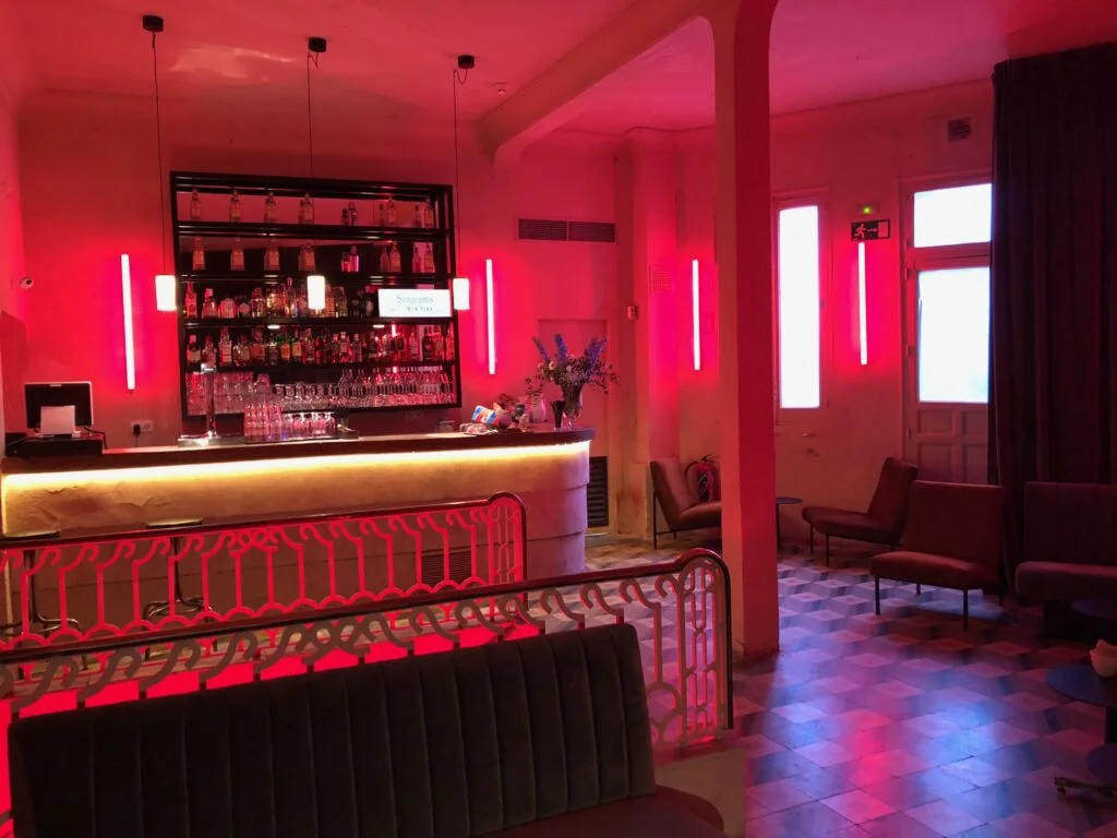 La Sala Equis por fuera no parece nada del otro mundo. Pero al final de pasillo, una vez que pasas la taquilla, abres las puertas y te quedas alucinado; lo que era un antiguo cine se ha convertido en un bar lleno de glamour con techos altísimos, gradas con cojines, hamacas, sofás, cervezas, cócteles, mucho moderneo y tapas para tomar. Subiendo las escaleras hay un bar de terciopelo en el que se puede estar más tranquilo que en la parte baja. Y subiendo un poquito más, te encuentras el rincón más valioso de toda la Sala Equis; una sala de cine con 55 butacas equipadas con sus respectivas mesas dónde junto con tu gin tonic puedes disfrutar de una peli antigua en su versión original.